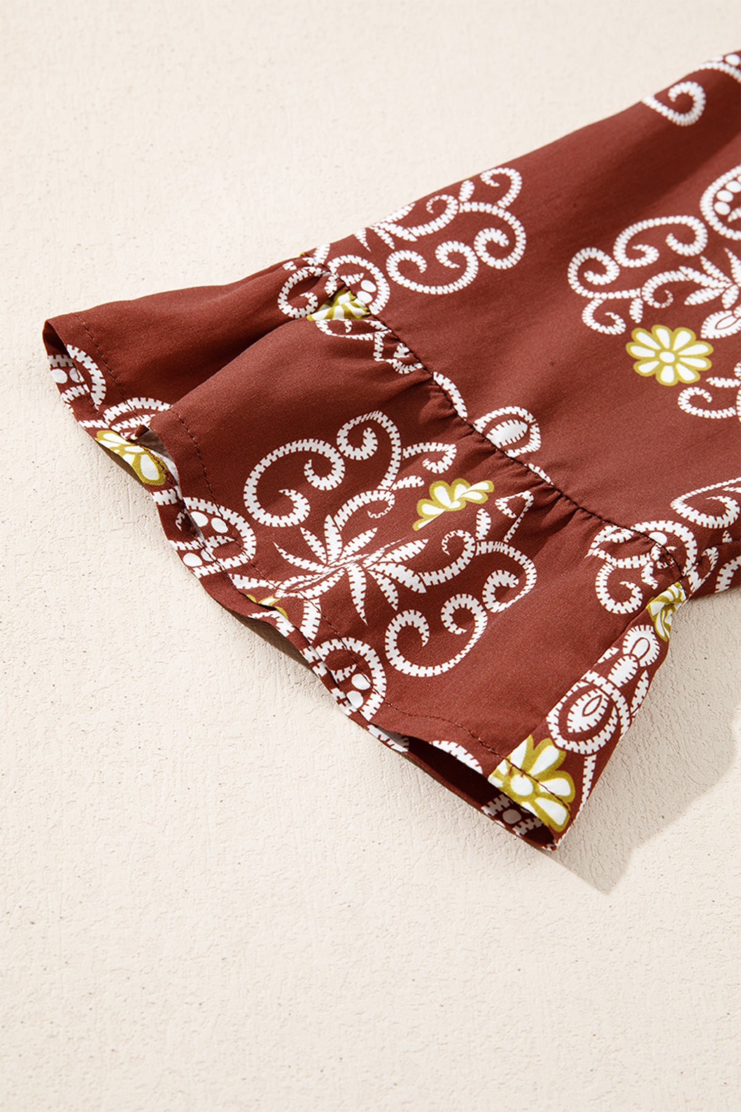 Brown Floral Print Belted Striped Trim Tiered Maxi Dress