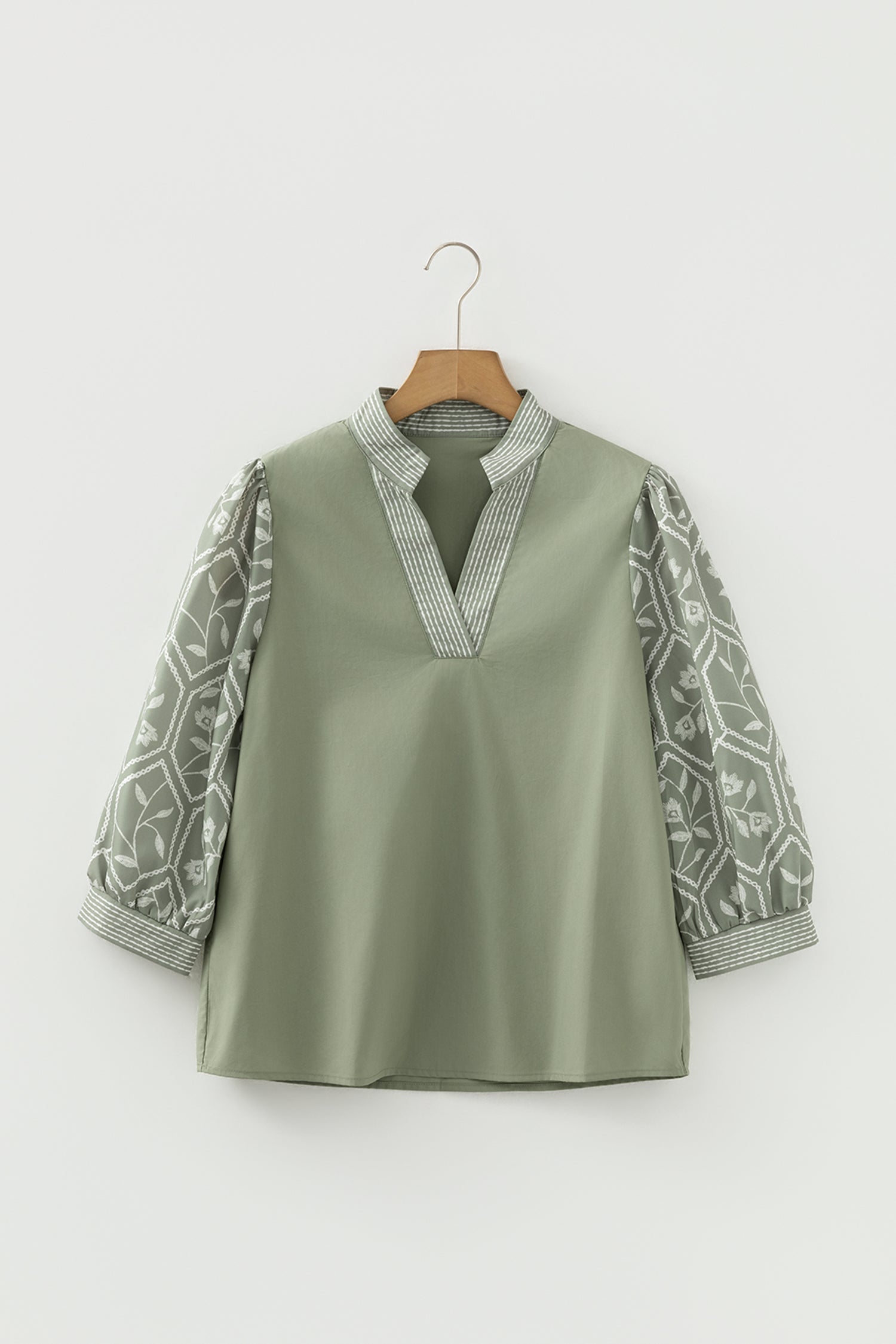 - Stylish floral patchwork blouse with a contrast V neck design.